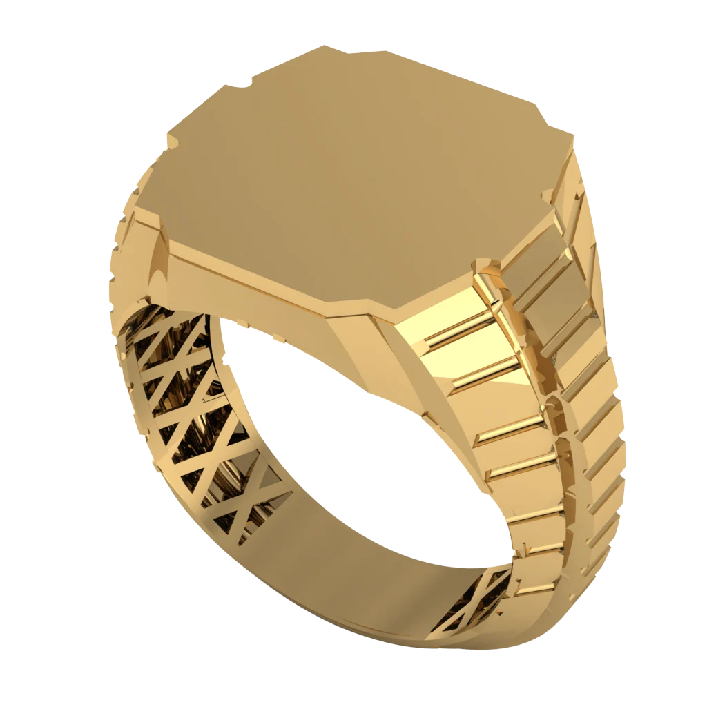 Лаконичная модель с гладкой многоугольной площадкой без вставок и рельефными боковыми гранями. Золото подчёркивает массивность и спокойную силу дизайна.