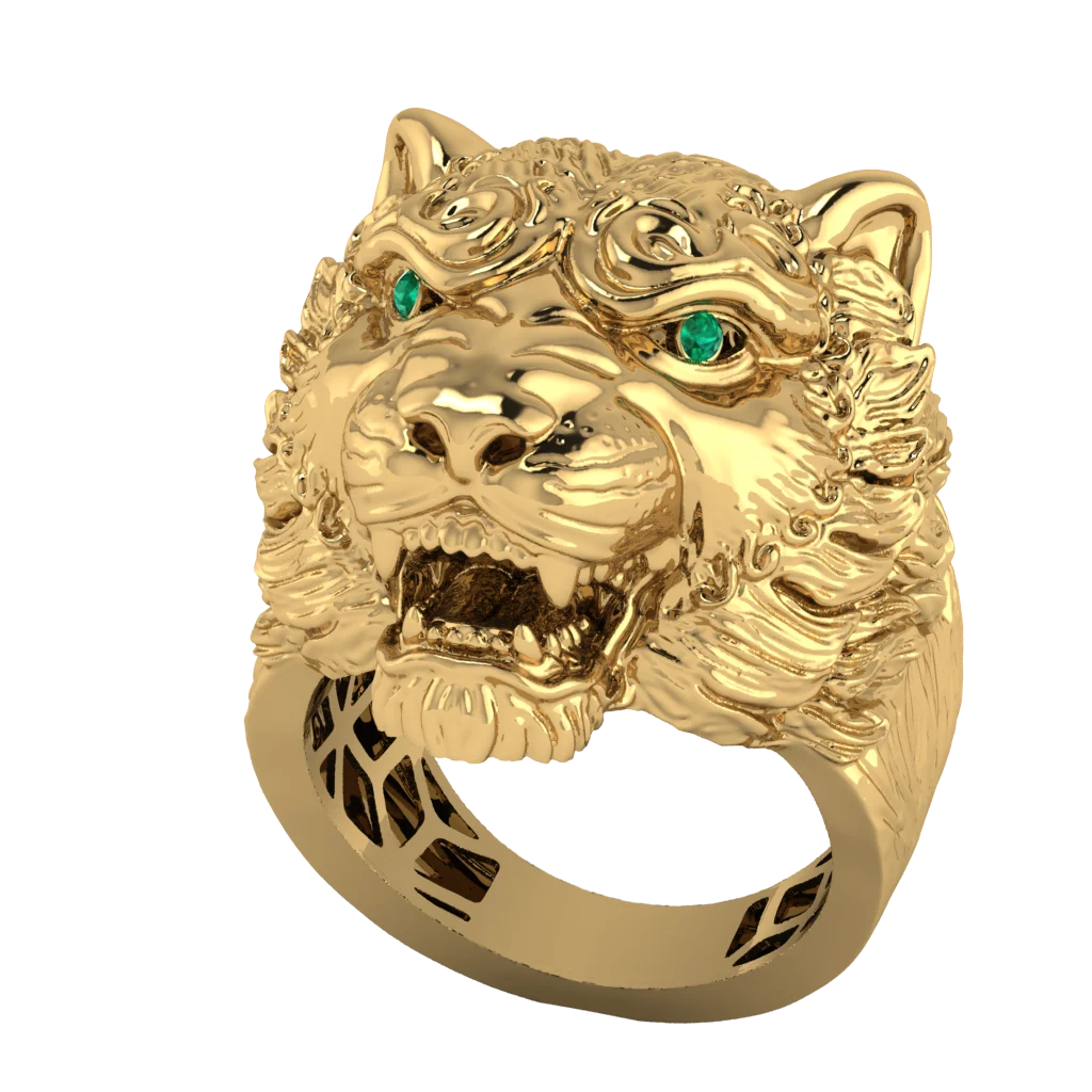 Мужское кольцо в виде головы хищника с зелёными глазами и детализированной шерстью. Золото подчёркивает агрессивную пластику и делает украшение особенно заметным.
