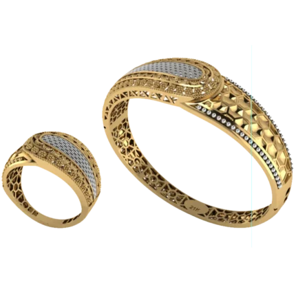 Открытый жёсткий браслет с аккуратной шириной и ровной дугой с лёгкой фактурой, которая оживляет поверхность и деликатными камнями, которые дают мягкое сияние. Жёсткая форма смотрится собранно и подходит для повседневных и вечерних сочетаний. Полировка подчёркивает золото и даёт ровные тёплые блики.