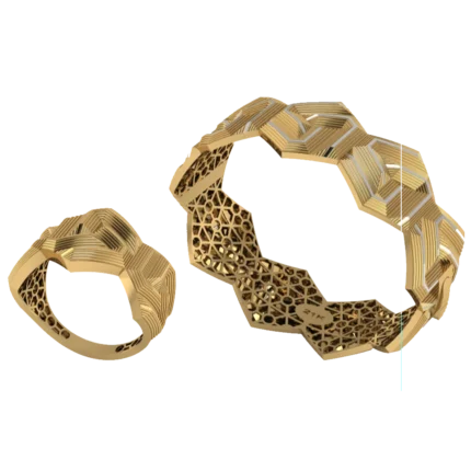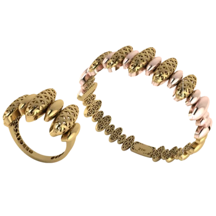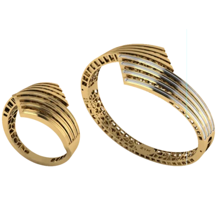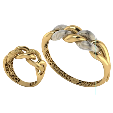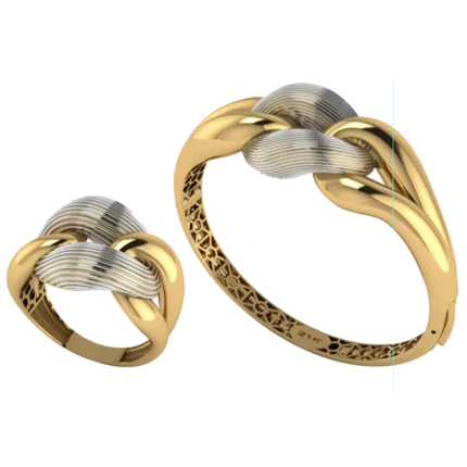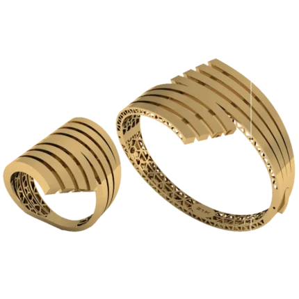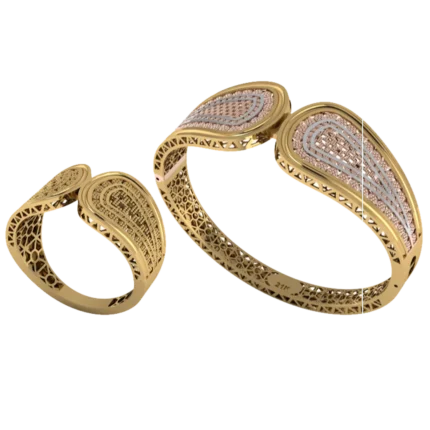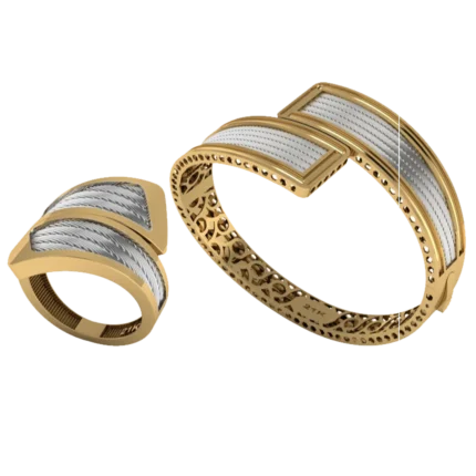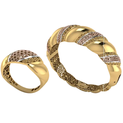 Жёсткий браслет-обод с широким профилем и уверенной линией по окружности с лёгкой фактурой, которая оживляет поверхность с небольшими камнями как точечными акцентами. Жёсткая форма смотрится собранно и подходит для повседневных и вечерних сочетаний. Полировка подчёркивает золото и даёт ровные тёплые блики.
